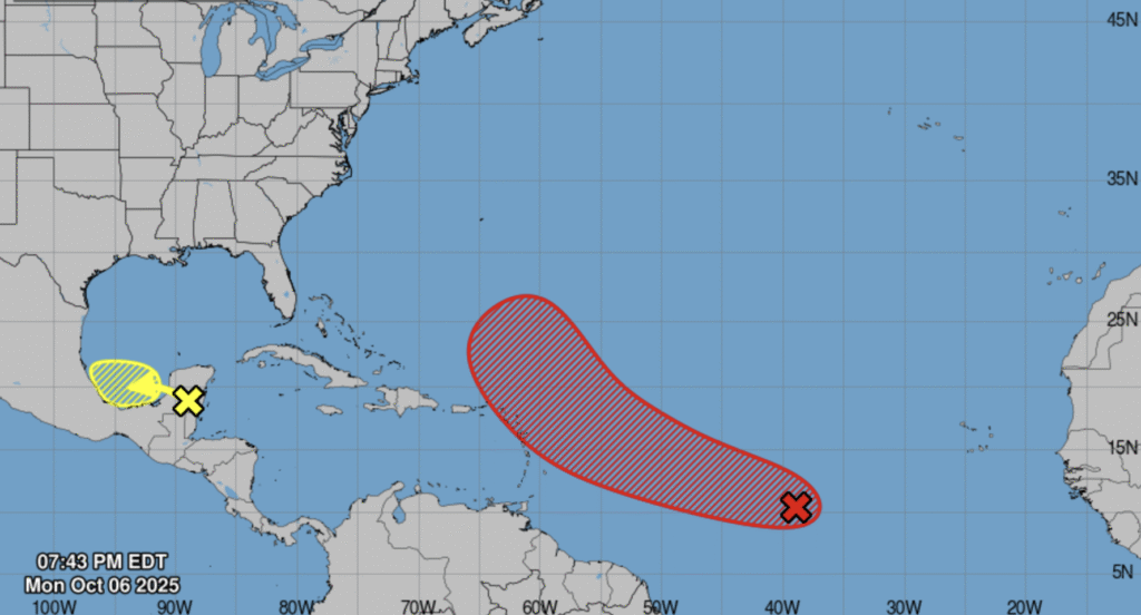 Yucatan Peninsula and Southwestern Gulf: A trough of low pressure currently moving across the Yucatan Peninsula is expected to emerge into the Bay of Campeche during the day on Tuesday. The system is producing a large area of disorganized showers and thunderstorms, and some slow development of this system is possible over the Bay of Campeche before it moves inland by the middle portion of this week. Regardless of development, areas of heavy rain and gusty winds are likely across portions of the Yucatan Peninsula, Belize, and southern Mexico during the next few days. * Formation chance through 48 hours…low…10 percent. * Formation chance through 7 days…low…10 percent.
