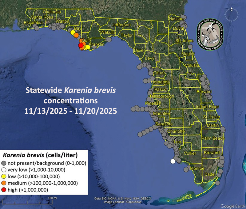 In Southwest Florida over the past week, K. brevis was observed at background concentrations in Pinellas County, offshore of Hillsborough County, and in Lee County. K. brevis was observed at very low concentrations in one sample collected offshore of Collier County.
