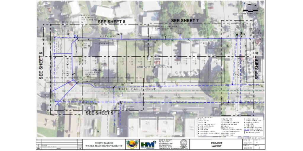 The City of Marco Island will be replacing the watermain in the Old Marco area beginning September 2, 2025.  Currently, the North Marco area is served by a combination of 4-inch and 8-inch asbestos cement water pipe, and 10-inch PVC water pipe. These pipes are nearing the end of their useful life and need replacement.  This project consists of replacing the existing asbestos cement water pipe along Bald Eagle Drive from Tampa Place to Palm Street, and increasing the pipe size for a 4-inch to 10-inch water pipe from Tampa Place to Lee Ave.  The project will also create a main water loop that will improve the fire protection flow.